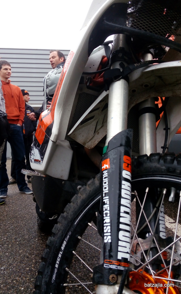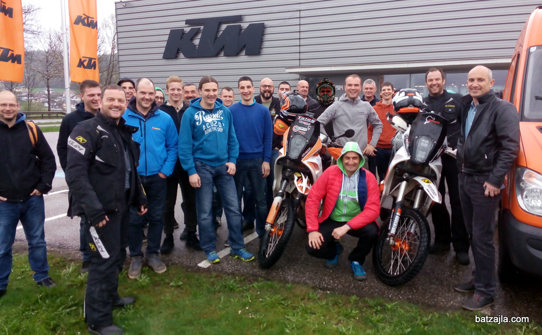 A veste, kaj je bil zame vrhunec ogleda sestavljalnice motorjev in tovarne agregatov? Debata z dvema (srečno?) ločenima britanskima pilotoma, ki sta se pred desetimi dnevi odpravila na 18-mesečno potovanje okrog sveta, vsak na svojem 690 Enduro z rally kit-om in na poti prišla pogledat rojstno mesto svojih mašin. Spremljali ju boste lahko na FB strani Mudd Life Crisis in ker pot financirata sama, lahko pričakujemo odkrito poročanje o tem in onem; kako se obnesejo gume, kaj bo na poti crknilo in tako dalje. Motorja, oba predelana v domači garaži, sta pred tem enkrat preizkusila v zahodni Afriki.